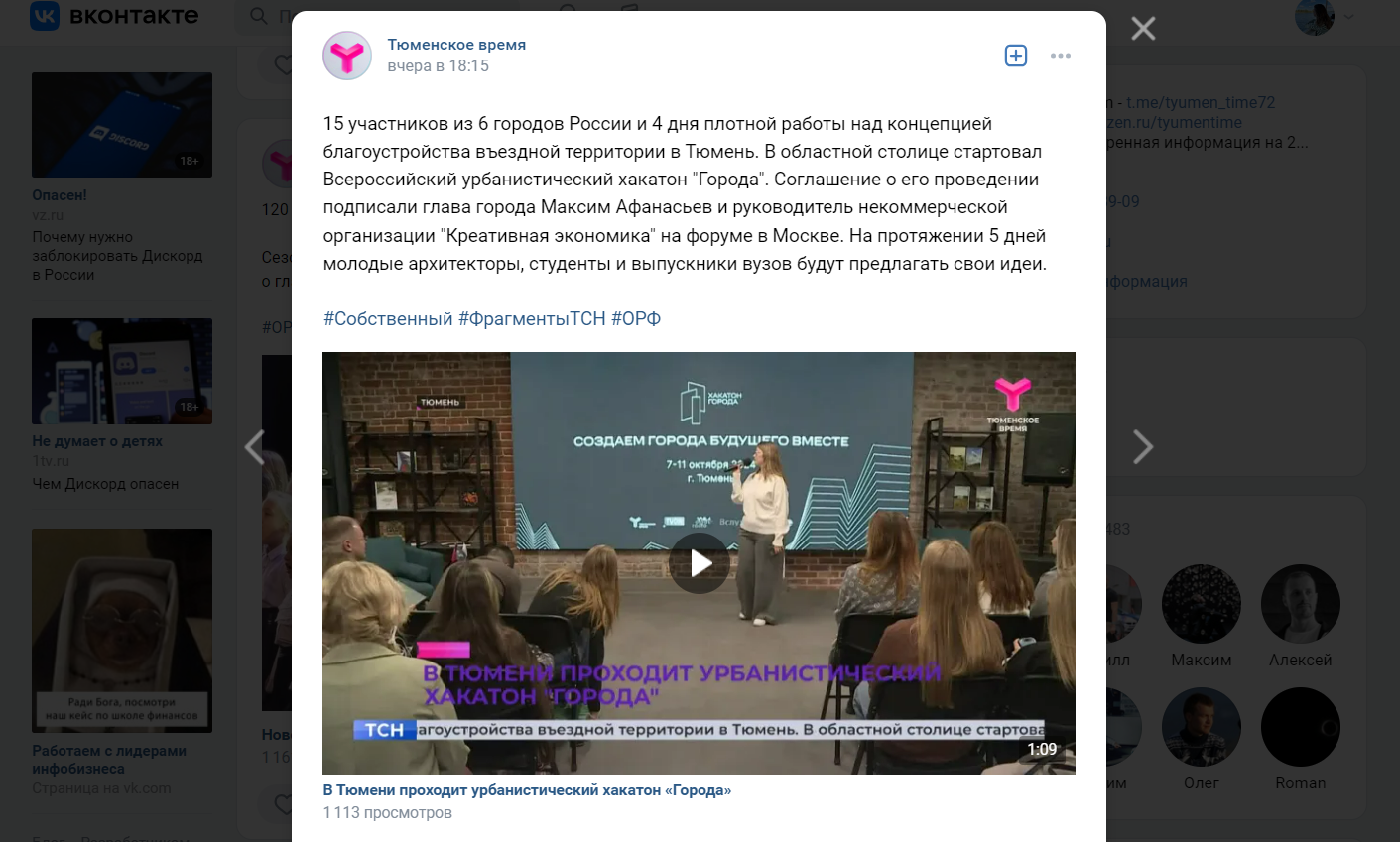 15 участников из 6 городов России и 4 дня плотной работы над концепцией благоустройства въездной территории в Тюмень. В областной столице стартовал Всероссийский урбанистический хакатон "Города". Соглашение о его проведении подписали глава города Максим Афанасьев и руководитель некоммерческой организации "Креативная экономика" на форуме в Москве. На протяжении 5 дней молодые архитекторы, студенты и выпускники вузов будут предлагать свои идеи.