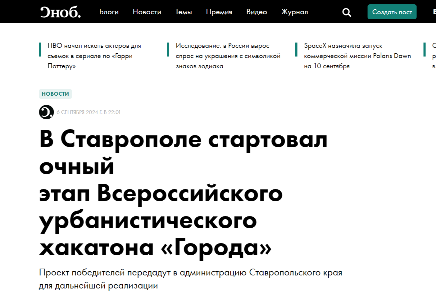С 6 по 11 сентября в Ставрополе пройдет очный этап Всероссийского урбанистического хакатона «Города». Его участники — студенты и выпускники МАРХИ, Института общественных наук РАНХиГС, Санкт-Петербургского горного университета, Академии строительства и архитектуры Самарского ГТУ, ЮФУ и КубГУ. В течение пяти дней две команды молодых специалистов, прошедшие все заочные этапы конкурса, встретятся и разработают проекты благоустройства и архитектурные решения для создания творческого кластера на базе краевого Дома молодежи. Проект победителей передадут в администрацию Ставропольского края для дальнейшей реализации.