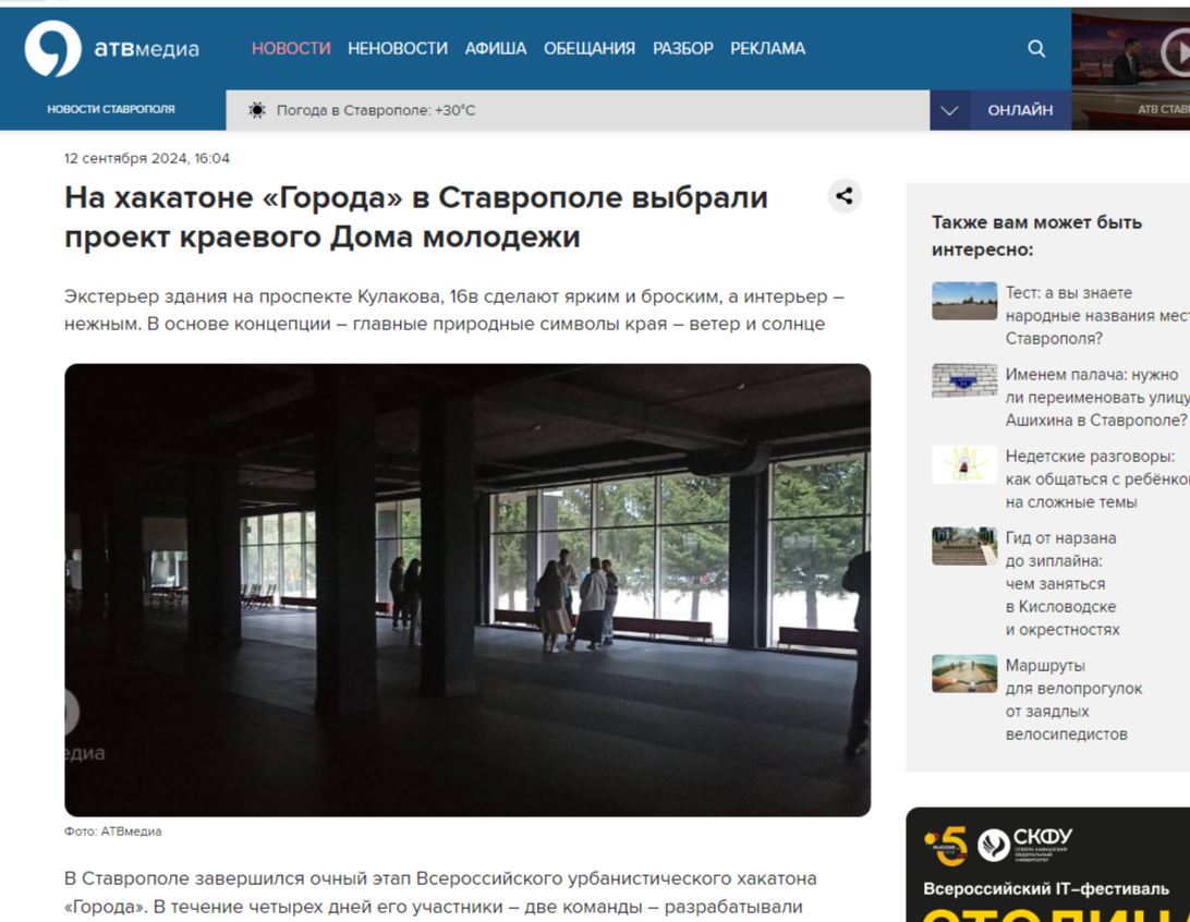 «Наши обе команды изначально работали совместно, поэтому эта победа – наша общая. Что касается нашей концепции, она отличалась по наполнению, визуальным образам. Мы придумали, что есть ветер и солнце – основные символы Ставрополья, которые отражаются у нас на территории, на фасадах и внутри. Мы сделали экстерьер ярким, насыщенным, активным, подвижным, а внутри сделали что то спокойное и приятное – зеленое, светлое, что-то, что что ассоциируется со Ставропольским краем», – отметила участница хакатона из команды-победителя Анна Чвилёва.