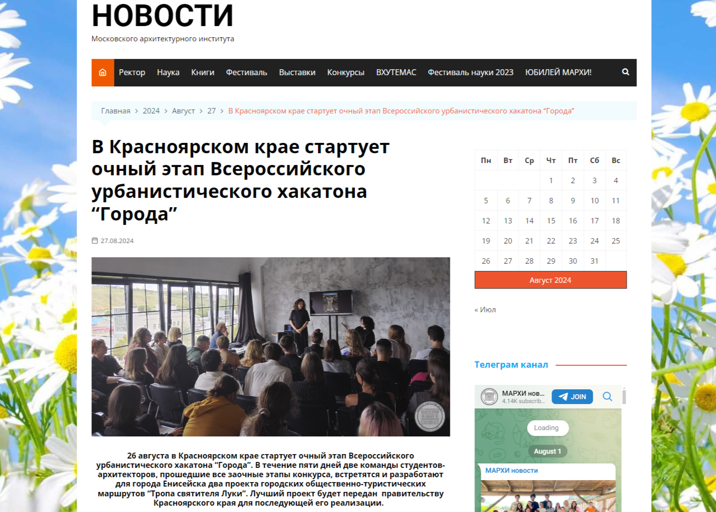 26 августа в Красноярском крае стартует очный этап Всероссийского урбанистического хакатона “Города”. В течение пяти дней две команды студентов-архитекторов, прошедшие все заочные этапы конкурса, встретятся и разработают для города Енисейска два проекта городских общественно-туристических маршрутов “Тропа святителя Луки”. Лучший проект будет передан правительству Красноярского края для последующей его реализации.