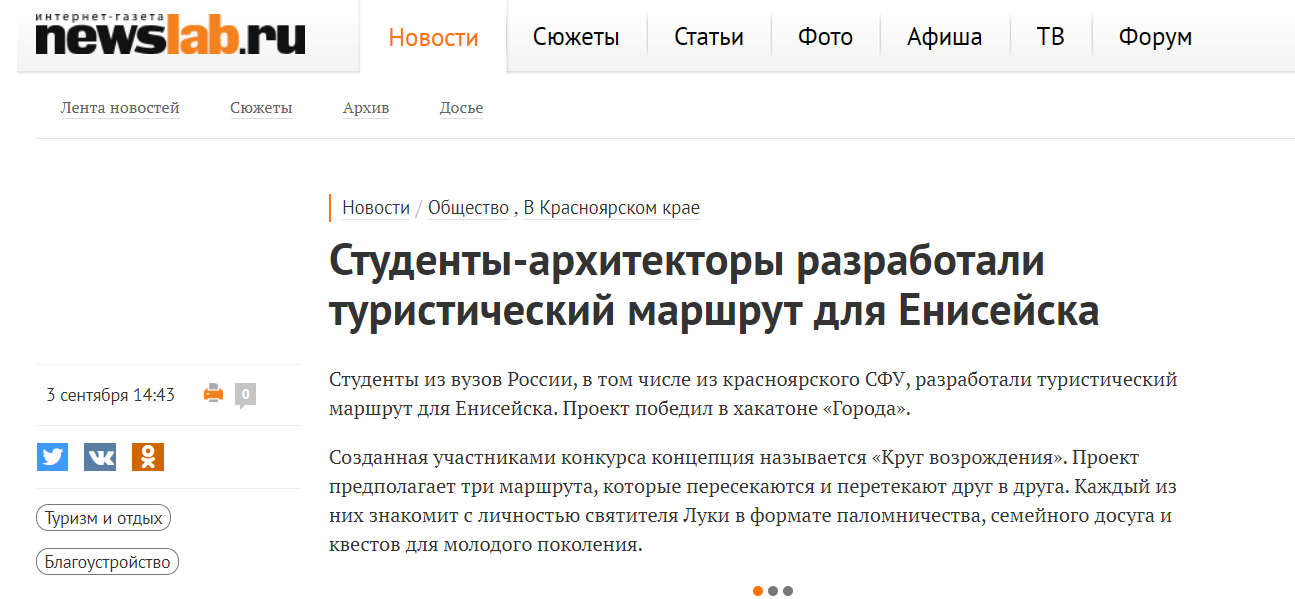 В создании архитектурной концепции общественно-туристического маршрута «Тропа святителя Луки» соревновались две команды молодых архитекторов из разных регионов России. В течение пяти дней они под руководством кураторов искали решения для раскрытия культурного и архитектурного потенциала Енисейска. Победила команда, в составе которой были студенты СФУ, ДВФУ и МАРХИ.