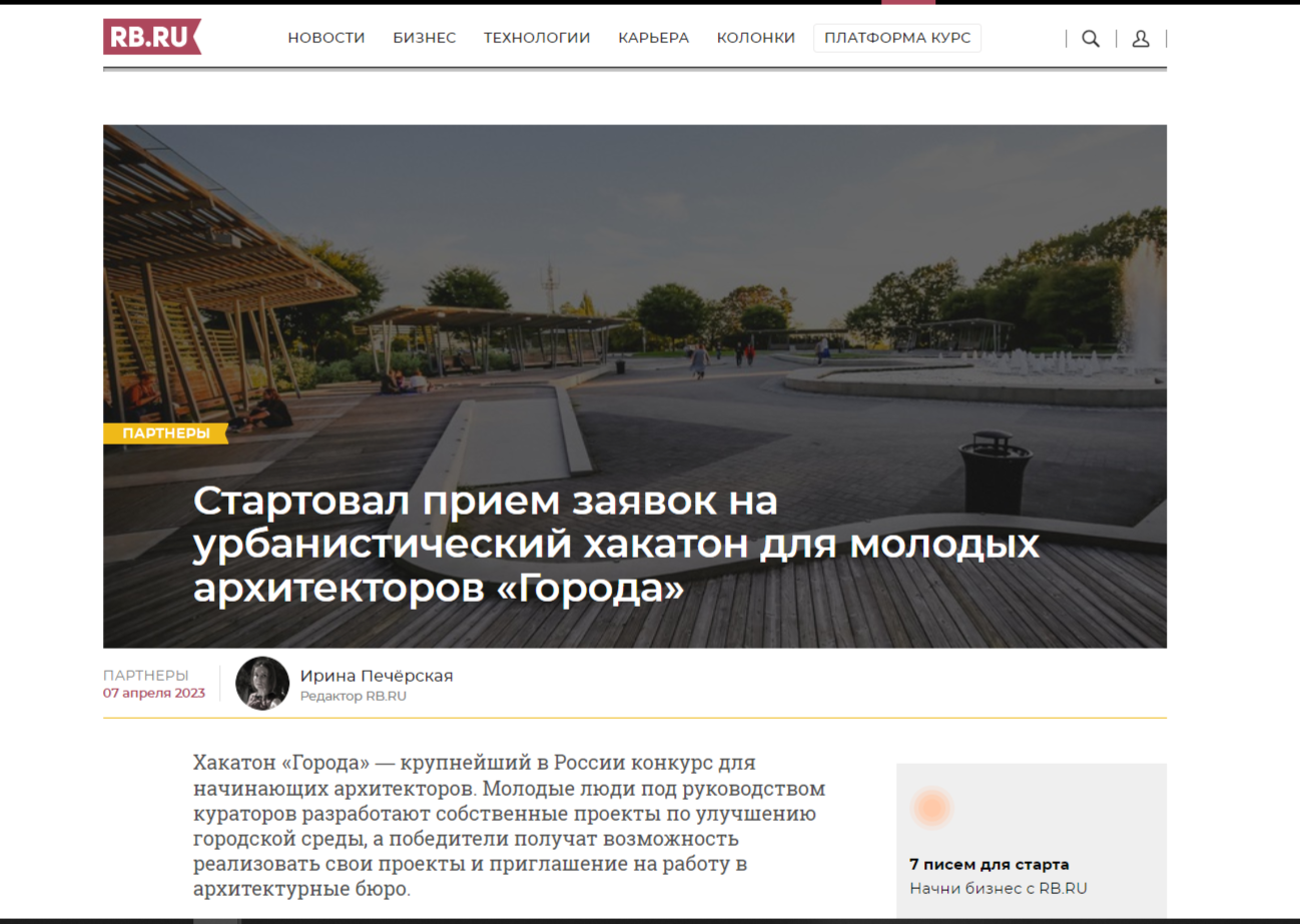 Хакатон «Города» — крупнейший в России конкурс для начинающих архитекторов. Молодые люди под руководством кураторов разработают собственные проекты по улучшению городской среды, а победители получат возможность реализовать свои проекты и приглашение на работу в архитектурные бюро.
