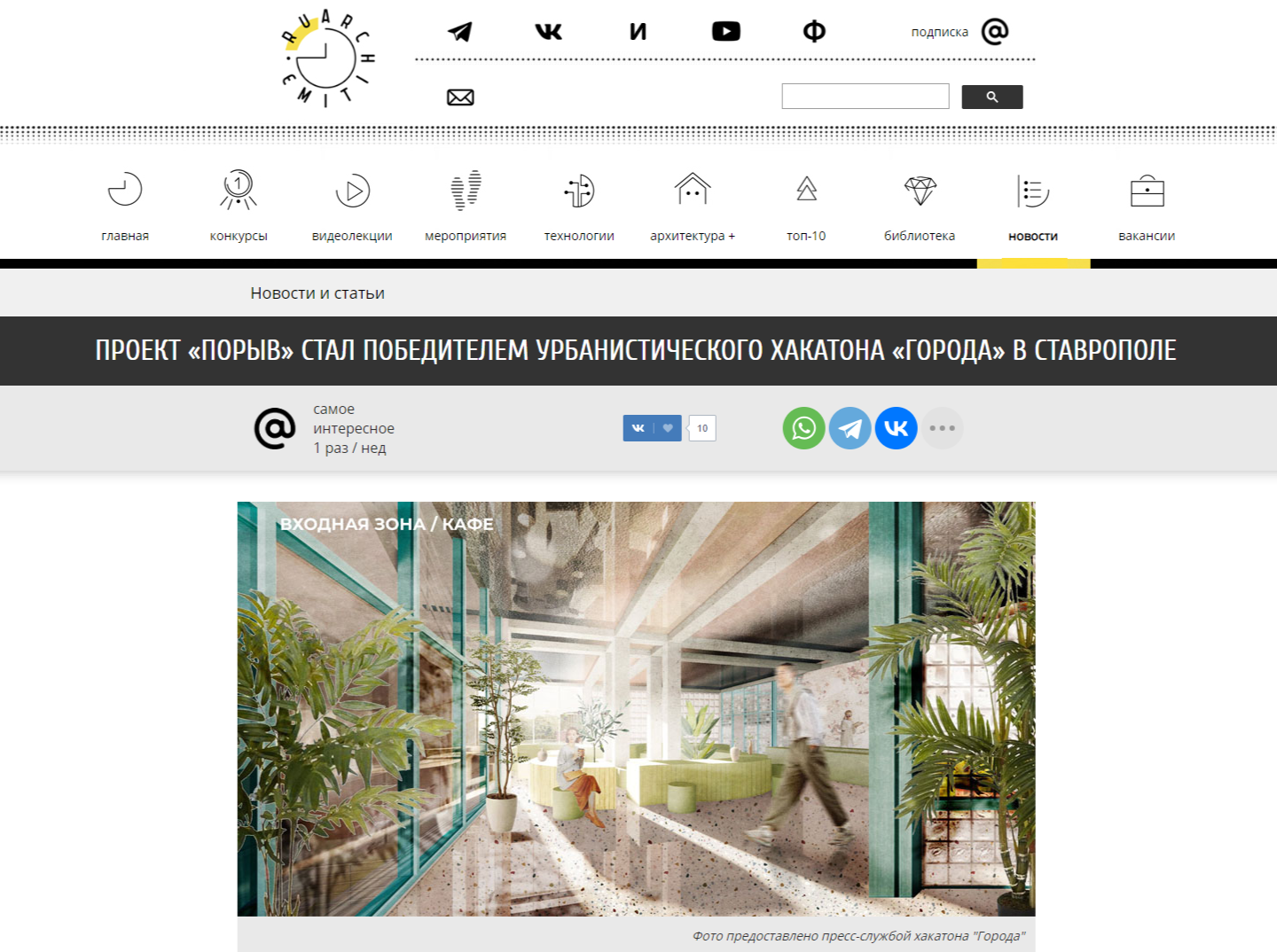 11 сентября в Ставрополе состоялся финал очного этапа Всероссийского урбанистического хакатона «Города». Его участники, молодые архитекторы и урбанисты из разных уголков страны, разработали два проекта благоустройства и архитектурные решения для создания творческого кластера на базе краевого Дома молодежи на проспекте Кулакова. Победителями стала команда, представившая концепцию под названием «Порыв». Как рассказали авторы, при разработке проекта они вдохновлялись природой столицы региона — обилием солнечного света, большим количеством зелени и знаменитыми ставропольскими ветрами.